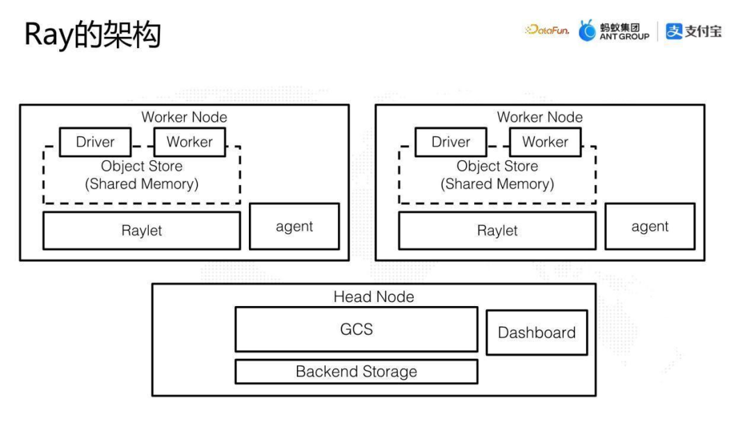 下面介绍一下Ray的架构。Ray在架构上与很多大数据系统类似,有一个主节点head节点,其他是 worker 节点。