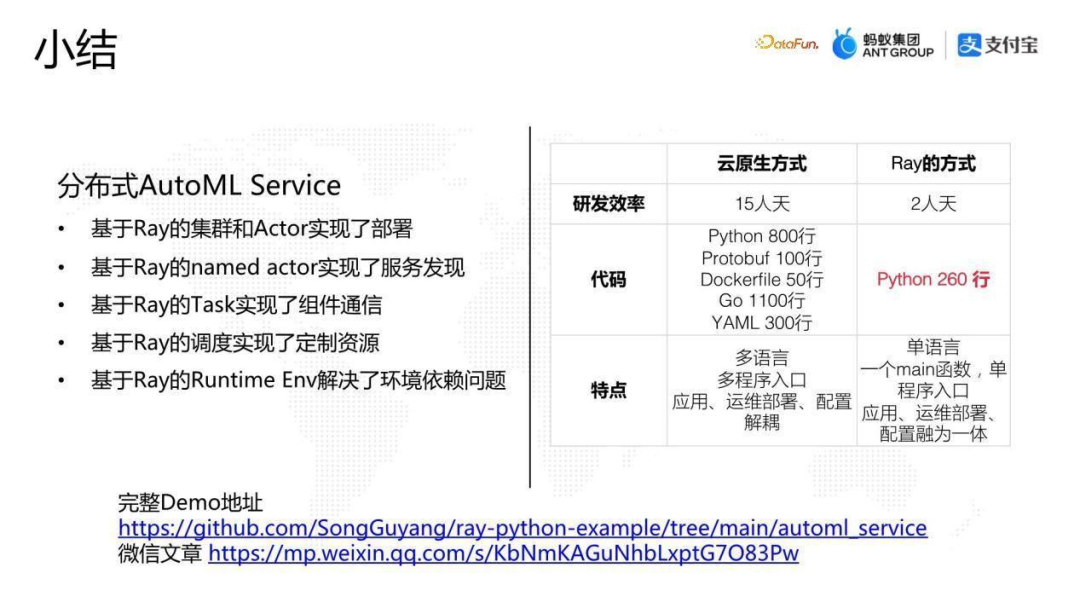 上图是我们做的一个实验,除了Ray+云原生的实现方式,我们也写了一套代码以云原生的方式来实现相同逻辑。代码已经放在上图下方GitHub 的repo上面,大家有兴趣可以查阅。