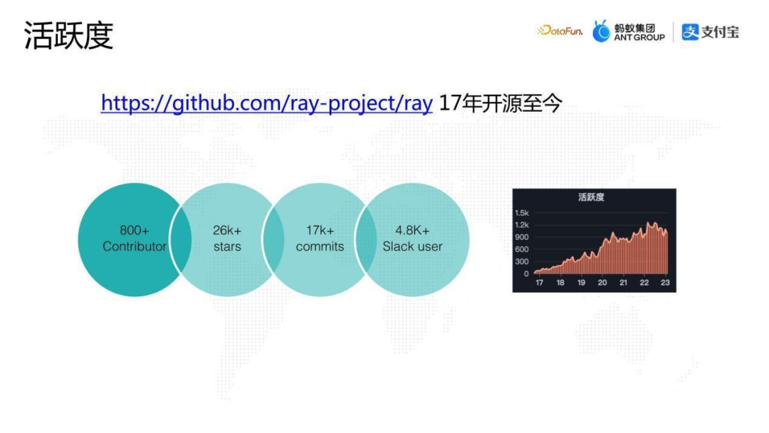 从Ray的活跃度来看,Ray从 2016 年开源至今,活跃度持续稳定增长。目前社区有超过 800个Contributor,Star数超过26K。