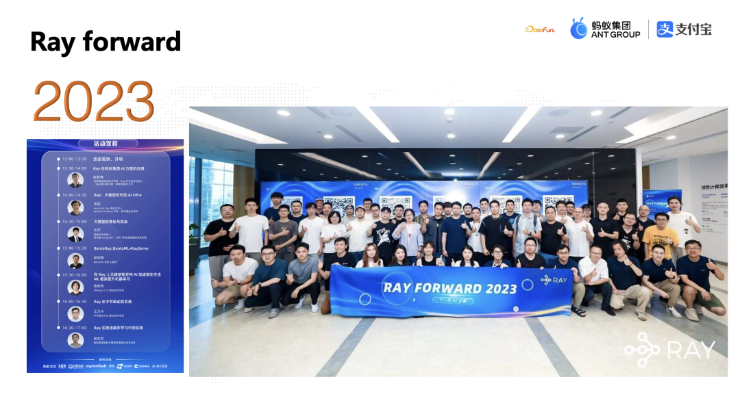 Ray forward已经在国内举办了五届,2023年7月2日蚂蚁刚刚举办了最新一届的Ray forward。从五届Ray forward可以感受到一个趋势,在最开始的两年,大部分的talk都是蚂蚁和加州大学伯克利分校RISELab实验室的人员分享,而近两年已经有越来越多的国内公司来Ray forward分享他们自己的议题,今年是议题最多的一次。