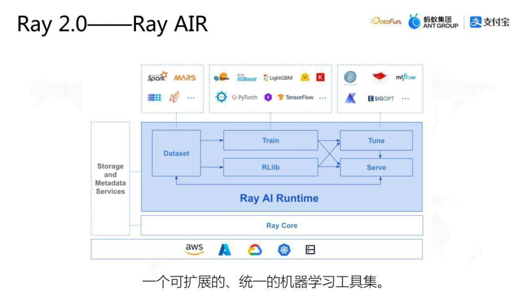 Ray的生态花费了非常大的精力在 AI 领域,上图是Ray 2.0的核心概念,叫Ray AIR(Ray AI Runtime)。Ray AIR的设计思想是在AI pipeline 的各个处理流程中去集成各种各样主流的工具,比如数据处理、训练、Tune、Serve等。
