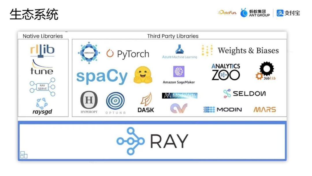 上图是一张比较老的图,主要是为了展示Ray的生态。主要分为两部分library,一个是Ray的Native Libraries,一个是Third Party Libraries。