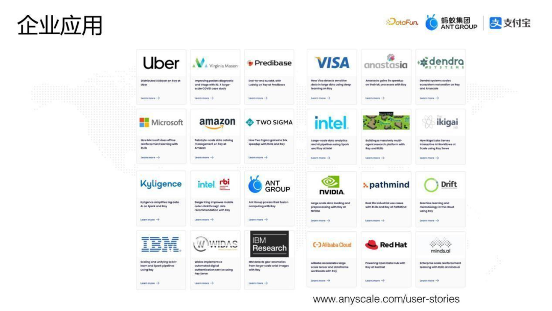 除了刚刚讲到的大语言模型场景下的OpenAI之外,上图列出了已经集成Ray很长时间的一些企业。整体来看,目前国外的发展更多一点,国内相对少一点,国外的很多大厂,包括一些传统企业,都在利用Ray来构建他们底层的分布式系统。