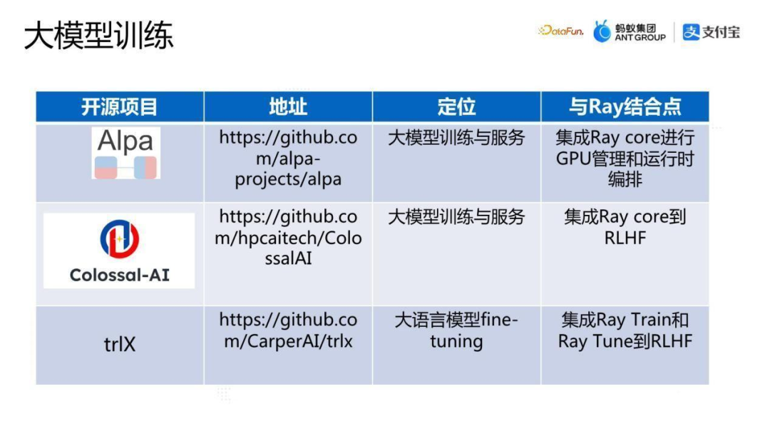 上图汇总了目前做大模型训练的一些已经集成了Ray的开源框架。