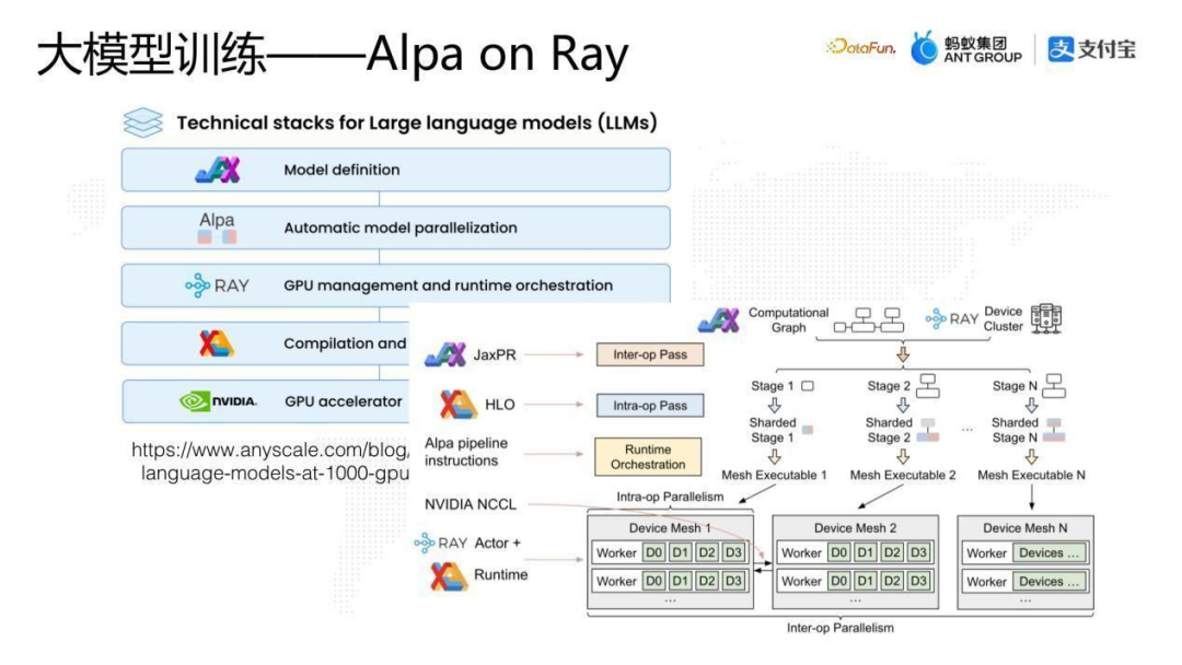 第一个项目是Alpa,是 Google 和UC Berkeley大学共同研发的面向大模型并行训练和服务的框架,框架利用Ray Core进行GPU的管理与运行时编排。