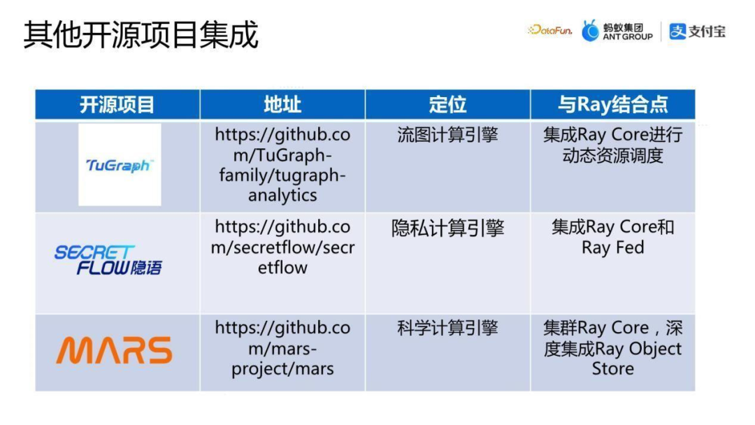 第一个项目是GeaFlow也就是TuGraph,TuGraph的流图计算引擎底层集成了Ray Core进行动态资源调度。