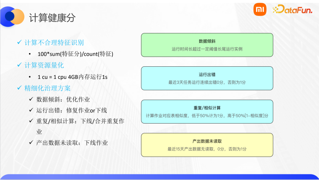 计算健康分是基于积累的数据治理经验沉淀出来的。主要是量化一些计算过程中不合理的特征进行计算,比如说数据倾斜、作业连续运行失败、数据的重复计算、相似计算。比如有些下游作业只是简单的对上游表做了select操作,然后就存储了一张下游表,这其实会造成存储的极大的浪费,或者两个业务人员用了相似的计算逻辑产出了两张相似的表也会造成存储浪费,这些我们都会进行识别和特征打分,相似度大于50%计0分,小于50%则为1分。此外,如果作业正常产出很长一段时间后都没有下游依赖作业或者访问量我们也可以判断它可以暂停调度。最终计算健康分就是这些特征的得分,除以特征的计数,再乘以100。 在计算资源上我们也做了一个量化,定义一个cu 等于1cpu=4GB 的内存运行1秒的算力,通过这个基本单位去量化每一个SQL,每一个作业运行时消耗的资源情况,同时会针对资源消耗Top的作业进行高效的治理,对得分低的计算特征也会给用户制定详细的指导策略。