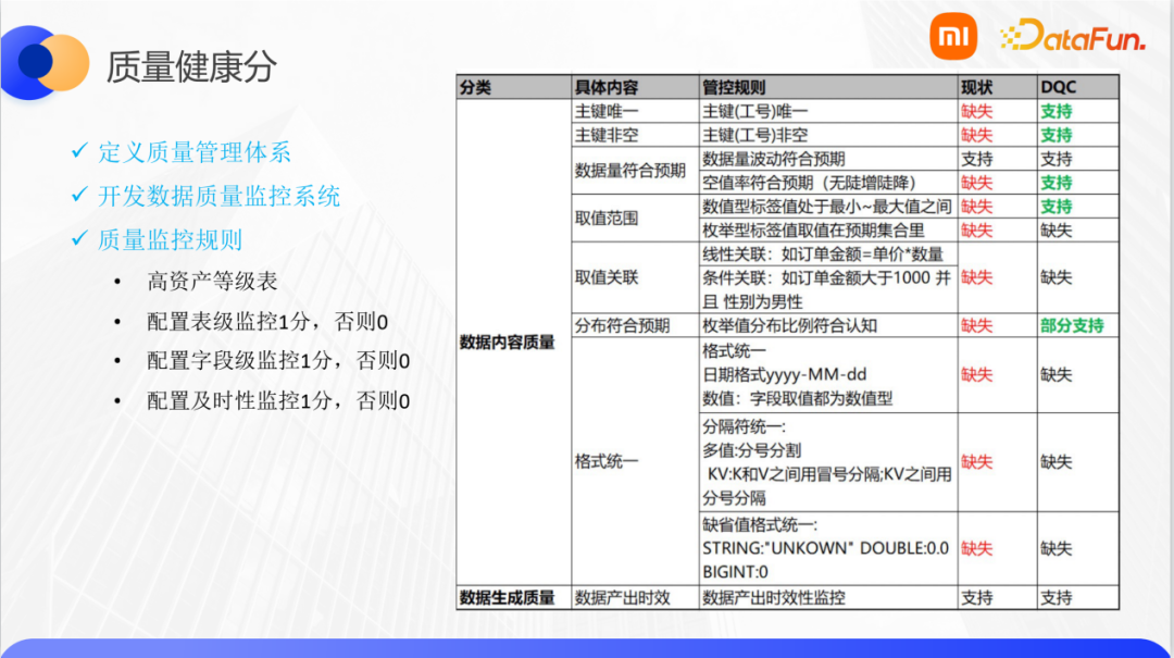 质量方面分为数据内容质量和生成质量,我们设计了一整个质量管理体系,并开发了质量监控系统,主要的监控规则如下图所示: