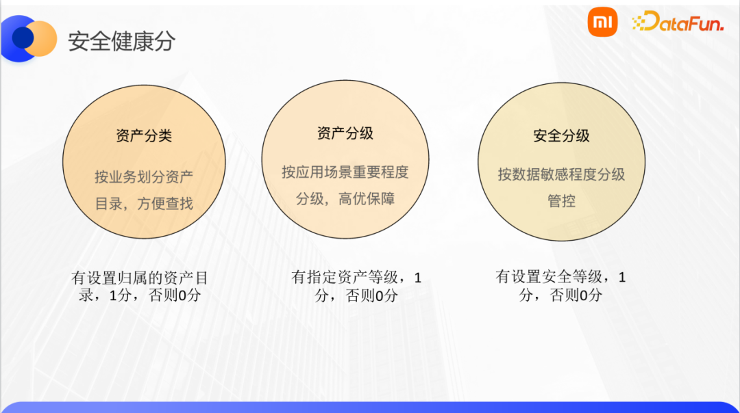 安全健康分主要分资产分类、资产分级、安全分级设置三个方面。资产分类是把表归属到某个资产目录下,方便统一管理和查找使用。资产分级是用来衡量数据应用场景的重要程度,越高资产等级的数据,会高优保证它们的资源调度,保障产出的稳定性。安全等级则设置了L1到 L4,从1到4,安全等级逐渐升高,比如用户ID、电话号码、地址以及聊天记录等个人敏感信息都是最高安全等级数据,从管控粒度上来说可以细到字段级的安全等级。安全分数计算规则跟计算健康分一样,就不再赘述。
