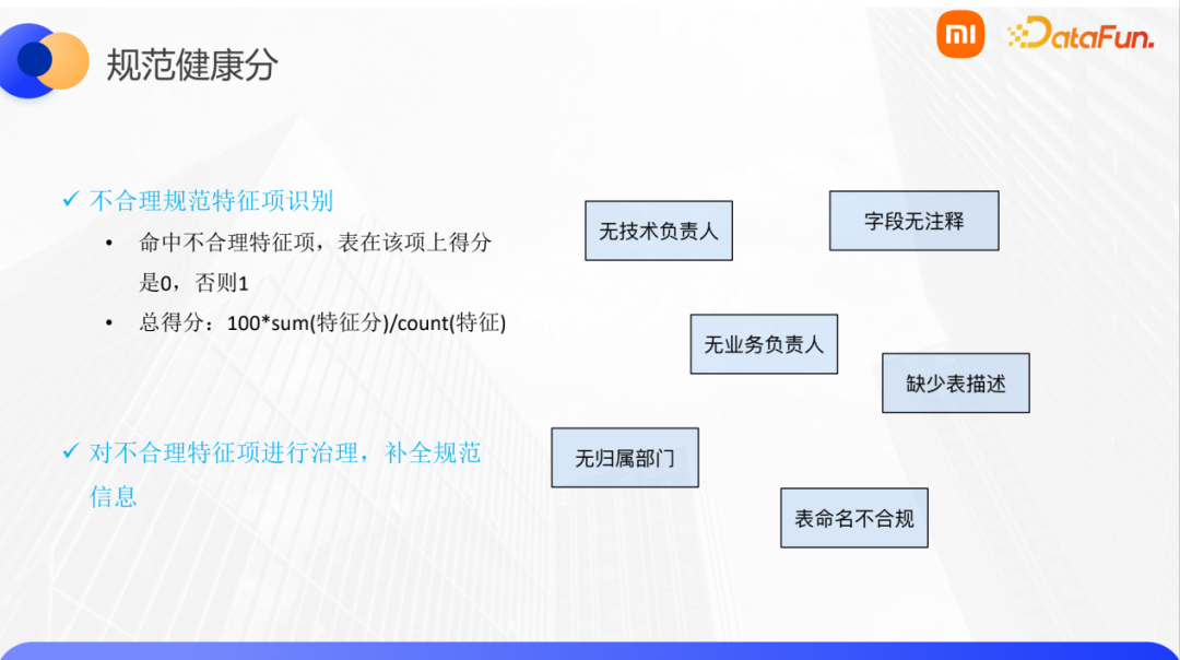 A:因为我们有元仓的建设,我们会把每个表的访问日志做数据采集,包括访问时间,访问的数据量等,依此可以统计访问频次和访问量。判断开始是否符合规范也是基于元仓数据,通过表的元数据判断是否有注释、owner等,通过表名拆解判断是否符合命名规范。
