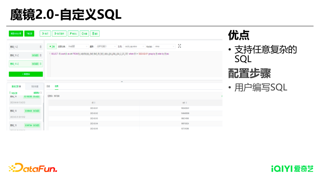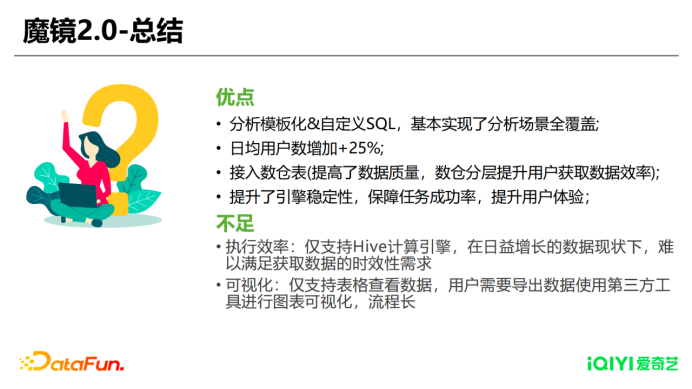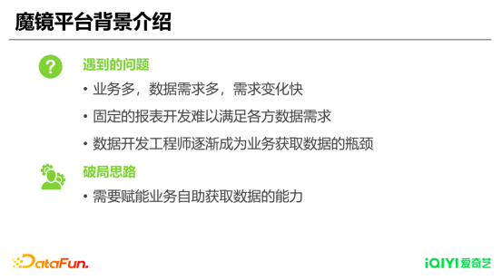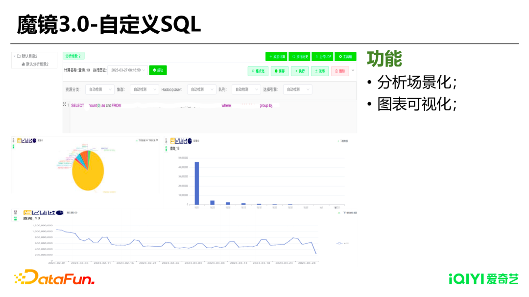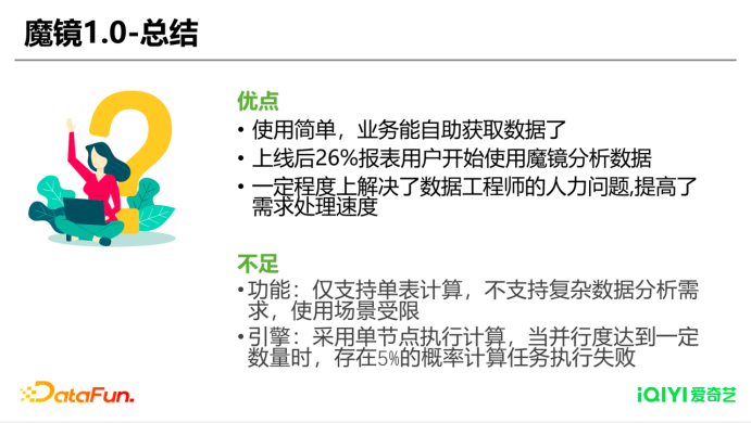 导读 随着互联网行业的快速发展,业务逐步多样化,固定的报表开发难以满足业务方的数据需求,数据工程师逐渐成为业务获取数据的瓶颈,难以满足业务的需求。今天分享的主题是爱奇艺魔镜如何解决大数据分析平台化的难题,提升业务分析效率。