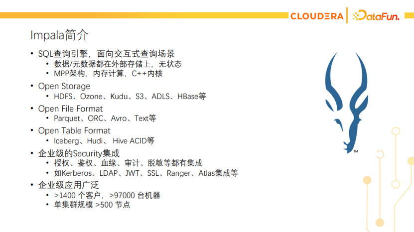 Impala是一个SQL查询引擎,提供交互式的查询。它天然就适合数据湖场景,因为其数据和元数据都保存在外部存储上,本身无状态,而且只有计算节点,很容易做到存算分离。另外,Impala也是一个高性能的查询引擎,它使用MPP架构设计,基于内存计算,内核是用C++编写的。最值得一提的是Impala对Openness的支持,作为数据湖上的查询引擎,它支持Open Storage,如HDFS、Ozone等。数据存储在这些Open Storage中,Impala没有自管存储。它支持Open File Format,如Parquet、ORC等开放、标准的文件格式。Impala没有自定义的文件格式。另外,它也支持Open Table Format,如Iceberg、Hudi等。在安全的集成上也较为成熟,比如授权、鉴权、血缘追踪、审计、脱敏等。