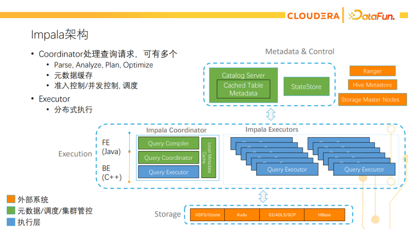 Impala架构如下图所示,橙色为外部系统。Impala有两个master节点,一个是Statestore,主要负责集群的心跳监测、新节点的发现和元数据的广播等;另一个是Catalog Server,主要负责跟外部系统的元数据打交道,同时也会缓存这些元数据。中间是执行层,有两种角色,一种是coordinator,一种是executor。Coordinator负责跟客户端打交道,接收查询请求并调度到集群中执行,最后返回结果给客户端。Impala中的Coordinator可以有多个,原生就是HA的。Executor负责查询的分布式执行,是集群的worker节点。下面一层是外部的存储,如HDFS、Kudu等。从图中也可以看出,如果往Impala集群里写数据,实际上是写到底层的外部存储,Impala自己是不保存任何数据或元数据的。