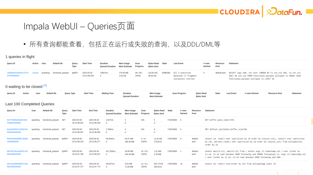值得一提的是,Impala的开源免费版就有丰富的WebUI。这里展示了查询页面的截图,所有查询包括正在运行的、失败的都可以在页面上看到。