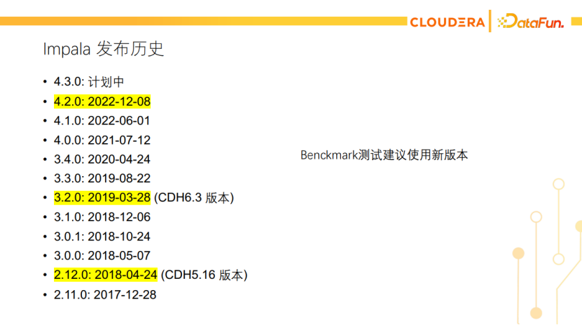 再看一下Impala的发布历史。Impala开发的比较早,在十年前就已经开始开发了,去年底发布了4.2版本。下一个版本是4.3,还在规划中。网上有一些做Benchmark对比的文章,使用的Impala都是CDH5或CDH6的版本,这些版本都是四五年前的版本了。Impala在这四五年间做了很多优化,所以大家如果测试的话,建议使用4.2或即将发布的4.3版本。