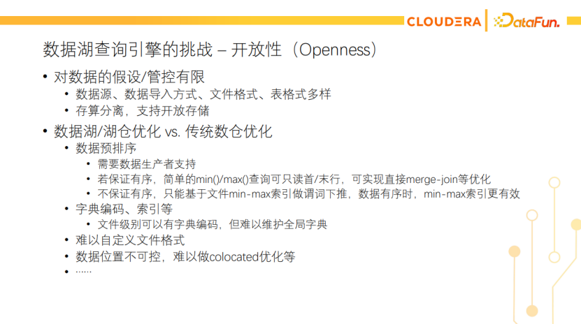 Impala是一个数据湖的查询引擎,数据湖查询引擎的优化相比于传统数仓的优化,有很多局限性,其中一个挑战就是源于对开放性即Openness的支持。为了支持Open File Format和Open Storage,很多层面都已经解耦了,所以很难做一些高耦合的优化。比如数据预排序,这个在湖仓需要生产者支持,在数仓都是自管的,就可以做这类的优化。如果能保证数据有序的话,那简单的一些min/max查询都有可能只读首行末行就能结束这个查询。对排序列做join或聚合时,也可以基于有序做merge-join这类的优化。但在数据湖场景中,数据生产者不可控,我们只能做一些保守的优化,比如基于文件的min-max索引做谓词下推。当数据有序时,min-max索引更高效。当数据无序时,查询结果也不会出错。还有像全局字典、全局索引这些都不可控,只能利用文件级别的。