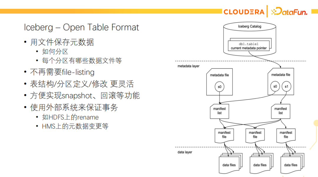 首先来看一下Cloudera的数据湖概览。在每个层面都有多种系统供选择,比如数据导入的系统,可以是Hive、Spark、Flink等;数据的存储可以是HDFS、Ozone,以及各种云存储等。数据的文件格式也是多种多样的,比如Parquet、ORC、Avro等。在数据组织方面,我们期望以Iceberg的table format来做统一的数据层,支撑数据湖分析的多种场景,如Hive负责的ETL、Impala负责的交互式分析等。要对接如此多的系统和格式,保持开放性(Openness)是至关重要的一点。