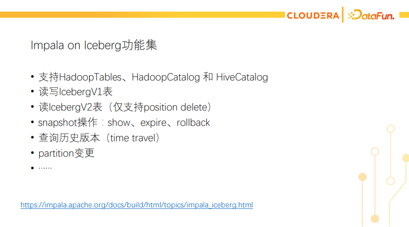 Impala对Iceberg的支持开发的比较早,所以大部分的功能都支持。支持常见的Iceberg Catalog,如HadoopTables、HadoopCatalog和HiveCatalog等。还有各种snapshot操作和历史版本查询等。更详细的功能表可以通过下面的链接去查看。https://impala.apache.org/docs/build/html/topics/impala_iceberg.html