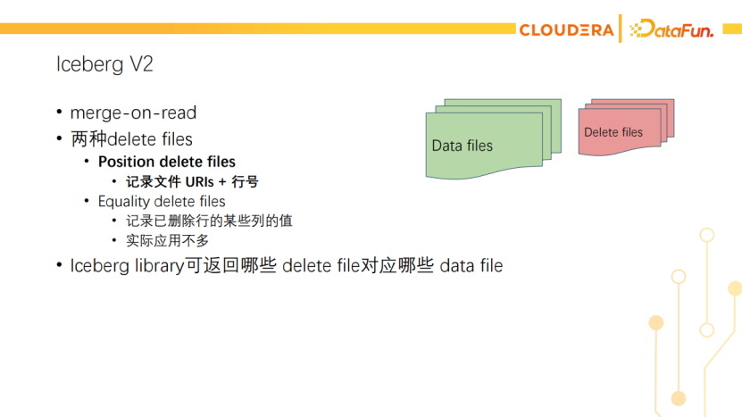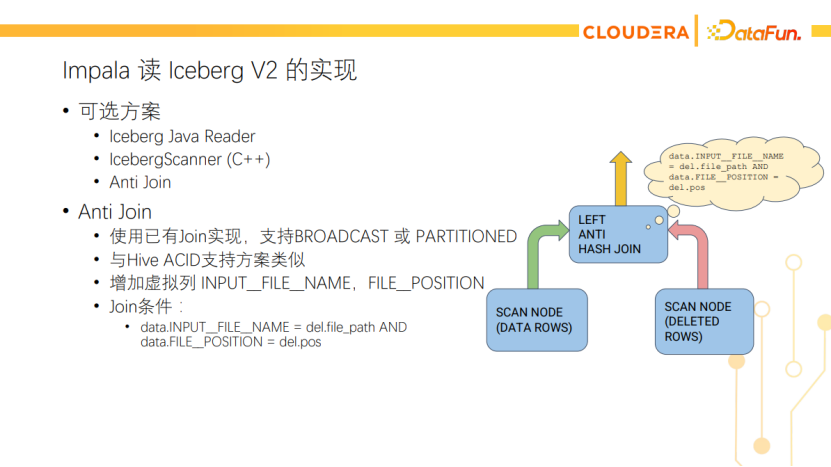 接下来介绍Impala在Iceberg V2上的工作。Iceberg V2是一种merge-on-read的设计,加入了delete files的概念。它会标记哪些数据是失效的,读的时候需要把它们和数据文件合并,才能展示真实的数据。Delete file有两种,一种是position delete file,主要是基于位置的delete,它会记录删除哪个数据文件里哪一行的数据;另一种是equality delete file,主要记录已删除行的某些列的值,实际应用不多。Impala目前只支持读包含position delete file的Iceberg V2表。