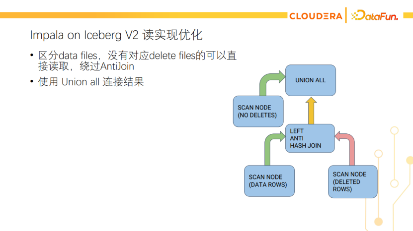 这里有个小优化,就是区分data files的情况来决定是否要AntiJoin。有些数据文件本身没有对应的delete files,可以直接读取。如下图所示,对于这类没有delete的data files,我们直接Scan。对于有delete的data files,还是用AntiJoin来做delete。最后用Union all来连接两边的结果。这样一方面降低了数据的延迟(没有delete的data files不需要等AntiJoin的Build side构建完就能生成数据了),另一方面也降低了AntiJoin的计算量。