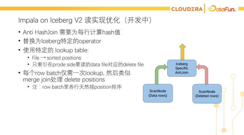 还有一个正在进行中的优化,就是将AntiJoin替换为Iceberg特定的operator,使用特定的lookup table,记录每个文件要删的行号集(有序)。这样每个RowBatch仅需一次lookup,因为ScanNode返回的RowBatch里的数据都属于同个文件,而且天然是按行号排序的。因此使用一次lookup就能知道是否有数据需要删除,有的话再和行号匹配即可。我们希望在4.3版本完成这一优化,具体可以关注IMPALA- 11619。