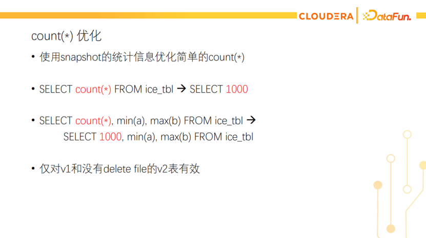 接下来介绍一个count(*)的优化。Count(*)是一个很常用的查询,Iceberg里snapshots的统计信息可以优化简单的count(*)。对于不带where条件也没有group by列的count(*)查询,我们可以把count(*)表达式替换为常量(即从统计信息得到的行数),如下图所示。但这种优化仅对v1和没有delete file的v2表有效。