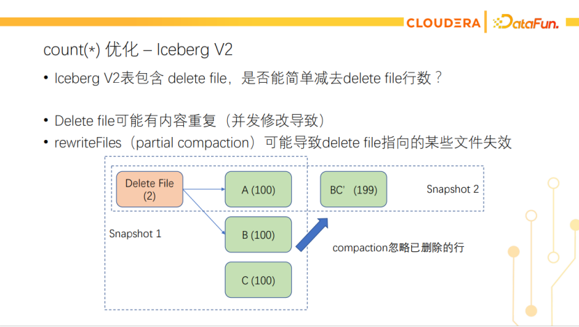 对于有delete file的V2表,我们也能统计出delete file的总行数。是否能简单地用data file的总行数减去delete file的总行数,作为整个表的总行数呢?这种做法是不安全的。不同的delete file可能删除了同样的内容,比如并发修改产生的delete file就可能删除相同的内容。另外partial compaction也可能导致delete file指向的某些文件失效。所以不能用这种简单的算法。