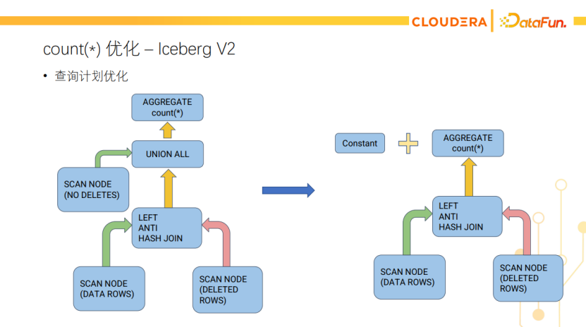 对于有delete file的Iceberg V2表,我们只能优化没有数据删除的data file上的count(*)。如下图所示,左图是未优化前的count(*)查询计划,右图把Union all转成一个加法表达式,把没有数据删除的data file上的count(*)换成了常量,另外有数据删除的data file还得通过AntiJoin读取,再求count(*)。这个优化的效果取决于有多少data file有数据要删除,如果大部分文件都没有对应的delete file,优化效果还是很明显的。