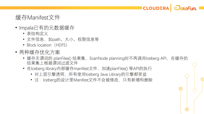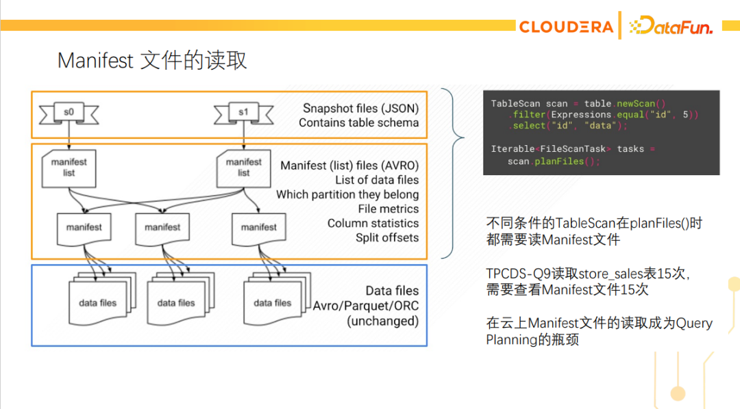 我们还做了一个与Manifest文件相关的优化,Iceberg提供了一个planFiles的API,这个API可以让查询引擎给定一些filter,然后Iceberg的API就会返回有哪些文件需要读。