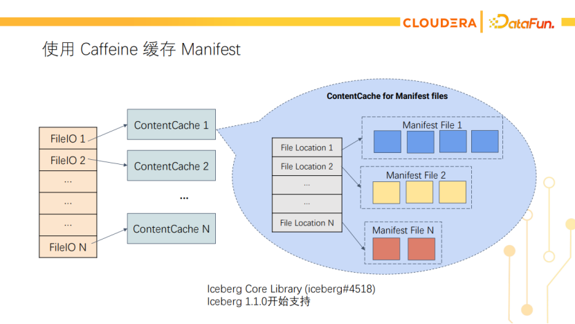 我们最终决定把这个缓存做在Iceberg Library内部,这样对上层引擎是透明的,而且所有引擎都能受益。另外Iceberg的Manifest文件不会被修改,只有新增和删除,因此也不用处理缓存失效的问题。如下图所示,我们使用一个两级缓存,从FileIO和文件路径映射到Manifest文件。这个功能已经贡献给了Iceberg社区,在Iceberg 1.1.0开始支持。