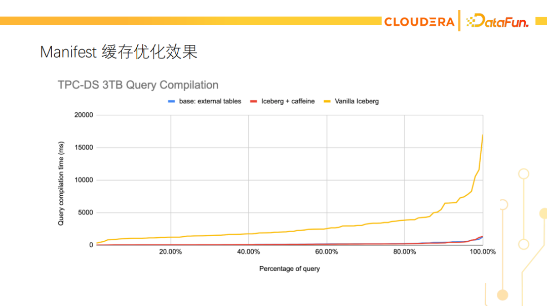 下图展示了TPC-DS 3TB测试的查询编译时间,黄线是原始的Iceberg实现,红线是加了manifest缓存的Iceberg实现,蓝线是查询Hive外表的时间。可以看到,性能优化效果还是比较明显的,优化后在Iceberg表上的planning时间与在Hive外表上的基本相同。