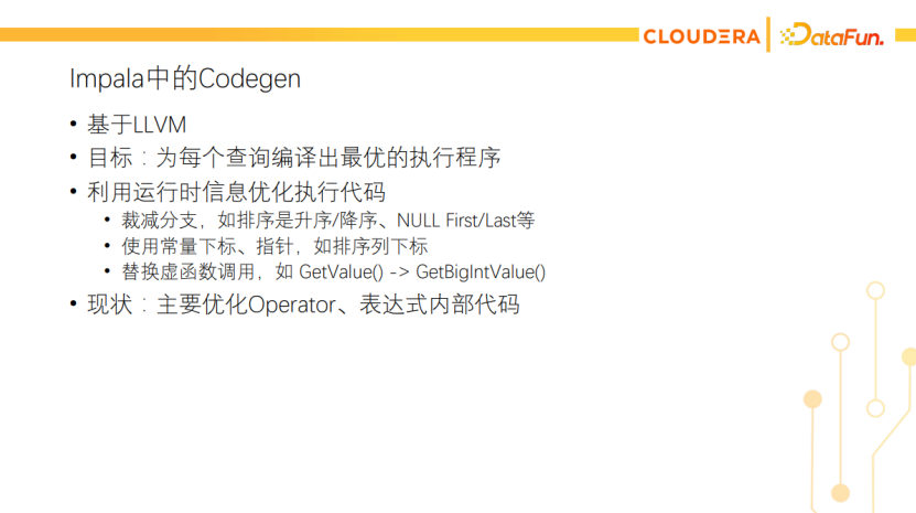 接下来介绍一下Codegen相关的优化。Codegen也是Impala的一个特色方向,主要是基于LLVM,目标是为每个查询编译出最优的执行程序。其工作原理是编译时先编译成IR代码(就是编译器的中间表示形式,相当于编译一半的状态),然后运行时根据查询给定的信息再完成编译。Impala在Codegen上的应用主要是优化Operator和表达式内部代码。