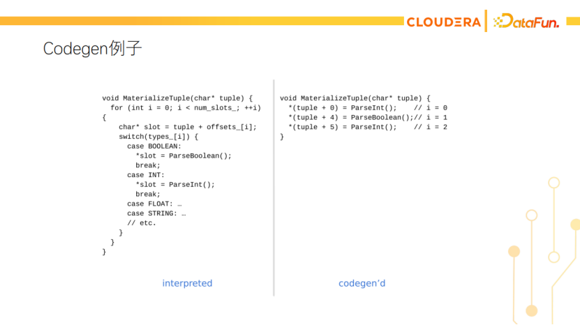 下面是Codegen的例子,左边是原始的数据库代码。其功能是物化一行数据,代码里有for循环,有各列偏移量的计算,还有switch语句根据不同列的类型调用不同的函数。在运行时查询已经给定的情况下,我们能知道总共要读哪些列,各列的偏移量就是常数了,另外也知道各列的类型,可以直接调需要的解析函数。因此codegen后代码可以像右边这样精简,而且没有了分支,执行效率会特别高。