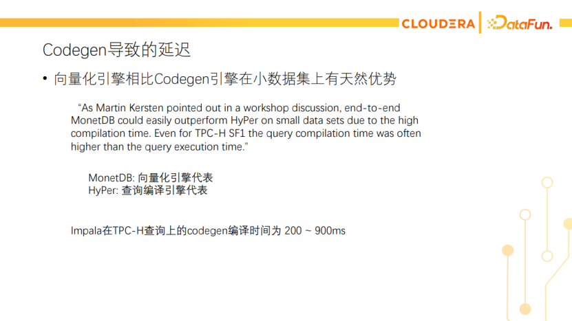 Codegen有一个天然的缺点是有延迟。另一条技术路线是向量化执行。向量化执行在小数据集上有天然的优势,它们生成执行计划后就可以直接执行了。Codegen的引擎在生成执行计划后还要做一个运行时的代码编译,所以存在延迟。学术圈里早有类似的对比,比如HyPer(查询编译数据库的代表)就在论文里说过,在小数据集上MonetDB(向量化执行数据库的代表)很容易跑赢Hyper。即使像TPC-H这样的benchmark,在scale factor为1时,Hyper的查询编译时间也高于查询执行的时间。Impala也有类似的问题,在TPC-H查询上的codegen时间可能达到900毫秒。因此建议大家在做Impala的性能测试时,要关注codegen的耗时,不要采用太小的数据集。如果发现query profile里显示的codegen时间占大头,建议调大数据集的规模,这样才能测试真正的执行耗时,更接近线上部署时的情况。