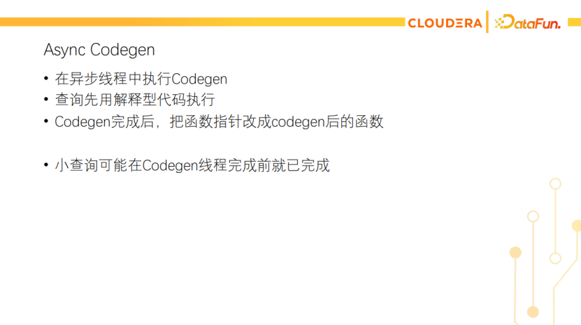 所以我们建议在生产集群上,对于数据集比较小,执行时间很短(如2秒内)的查询,可以开启异步的Codegen。
