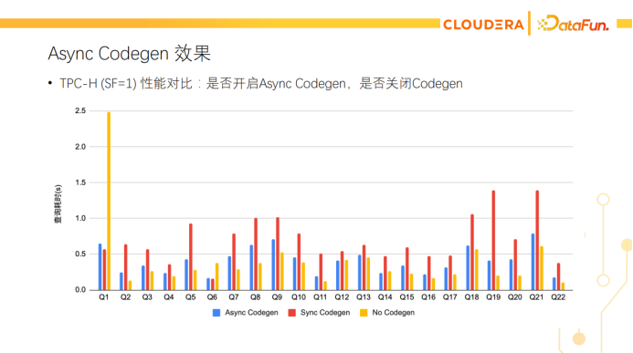 针对Codegen产生额外延迟的问题,我们也有工作在优化,其中一个工作就是异步Codegen。在查询执行时用异步的线程来做Codegen,查询先用解释型代码(即原始代码)来执行,等Codegen完成后,把对应的函数指针原子地替换为Codegen后的函数。这个优化对于小查询特别有用,它们可能在Codegen线程完成之前就执行完了,也就没有了等待Codegen带来的延迟。下面展示了TPC-H在scale factor为1时的性能测试。红色是原始的Codegen,黄色是关闭Codegen,正如前面所说,很多小查询关了Codegen跑得更快。蓝色是开启了异步Codegen的性能,很大程度上避免了Codegen带来的延迟。