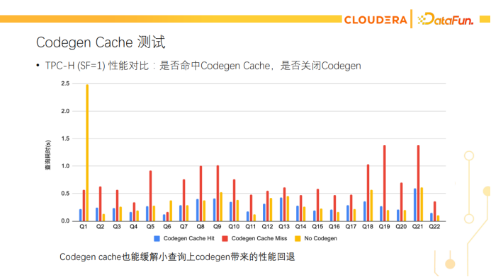 另一个解决Codegen延迟的优化是Codegen cache。Impala里的Codegen是以Fragment为单位进行的。每个Fragment codegen出来的代码会被缓存下来,后续的查询如果有相同的代码,可以直接复用codegen后的结果。如上图所示,两个count(*)查询只有filter不同,F01的fragment是完全相同的,可以命中codegen cache。如果是相同的查询重复跑,则所有fragment都能命中codegen cache。下面是Codegen cache的在小查询上的性能测试,红色是原始的实现 (即同步Codegen,以及没有Codegen cache)的性能,黄色是关闭Codegen的性能,蓝色是开启Codegen cache的性能。可以看到Codegen cache也能弥补小查询上Codegen带来的开销。