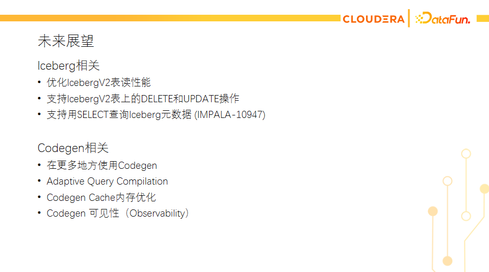 最后介绍一下Impala在Iceberg和Codegen这两个方向上的Roadmap。在Iceberg方面,还会继续优化v2表读性能,另外会支持v2表的delete和update操作,支持select查询Iceberg元数据等。在Codegen方面,会继续深耕,比如在更多地方使用Codegen,用自适应的方式去做Codegen(Adaptive Query Compilation)等。Q1:Impala社区有没有支持向量化的计划?