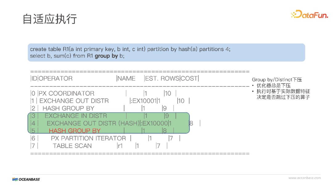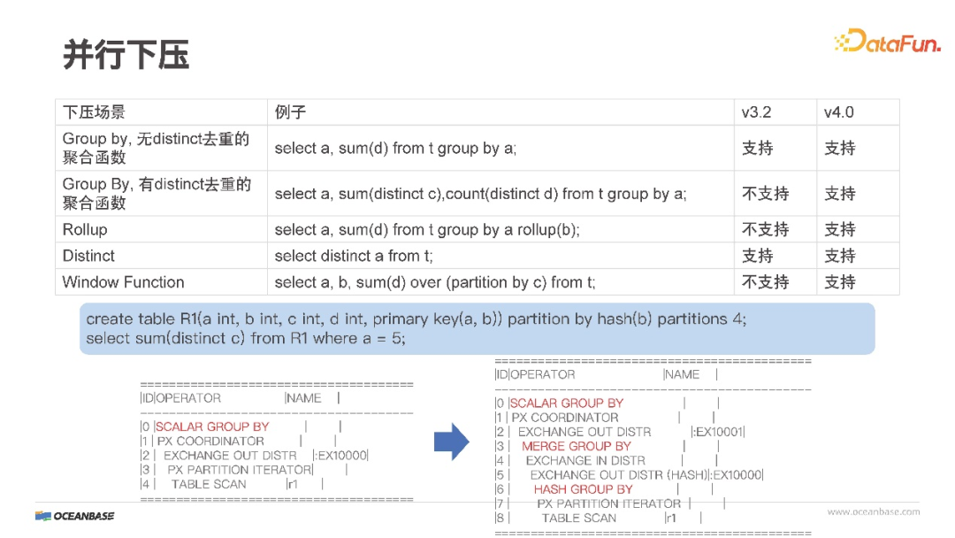 前文讲到的 group by 的例子是有下压的策略, OceanBase 3.x的版本对于有一类的执行计划是不能够做并行下压的,在 4.0 之后可以完全支持,因为引入了三阶段下压的策略。