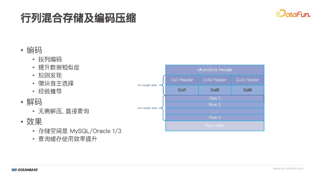 除了通用压缩,由于行列混合的模式,OceanBase的行列混合模式可以通过按列的方式进行压缩。数据表按数据分成多个Row Group,并按列的方式存储在磁盘上。因此,在磁盘上,每个数据块都是以列为紧凑的存储方式存储,这对于压缩非常有利。刚才为什么说“同一块数据从MySQL迁移到OceanBase可能有三倍的压缩率”?主要是由于LSM-Tree,在编码后,又进行了通用压缩,因此具有非常高的压缩比率。并且,它能够在线进行这种压缩算法,而B+树无法实现。OceanBase的好处主要在于LSM-Tree的后台整理数据的特性,因为SSTable的基线数据在下一次合并和整理时是后台处理的,而不是在用户执行插入操作时直接进行压缩。