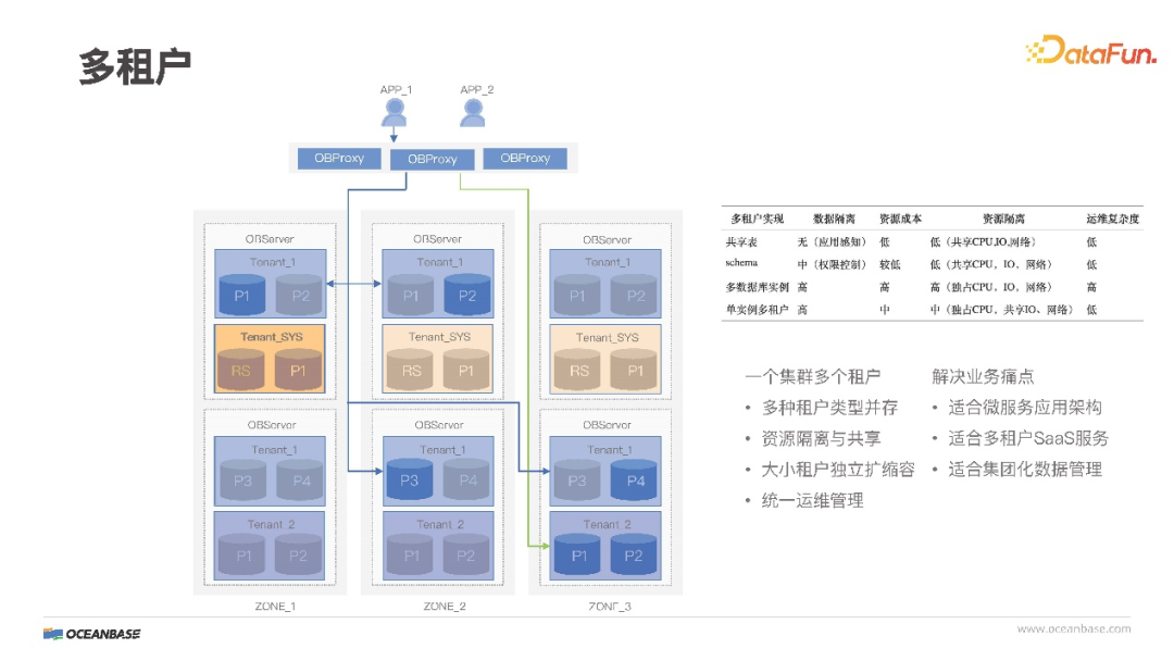 OceanBase本身是原生的多租户的数据库,前面介绍的架构其实比较简单,在其架构上层还有租户的概念。在OceanBase的集群中,可以有若干个租户,相当于虚拟的容器,每个容器可以看作是数据库的实例。这些容器主要限制CPU、内存和IOPS的使用。有了这项技术,就可以实现多租户,就做到了刚才所说的CPU和内存的隔离。同样的技术也可以用于HTAP,即TP和AP负混合负载的场景。因此,另外一项技术——资源组得以发展。