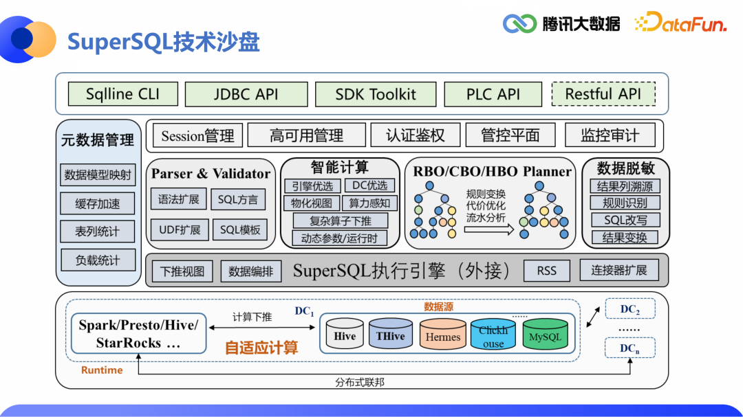 跨源:支持访问不同类型/版本的数据源 跨引擎:支持外接多类分布式计算引擎 跨DC:支持跨集群/地域的SQL编排