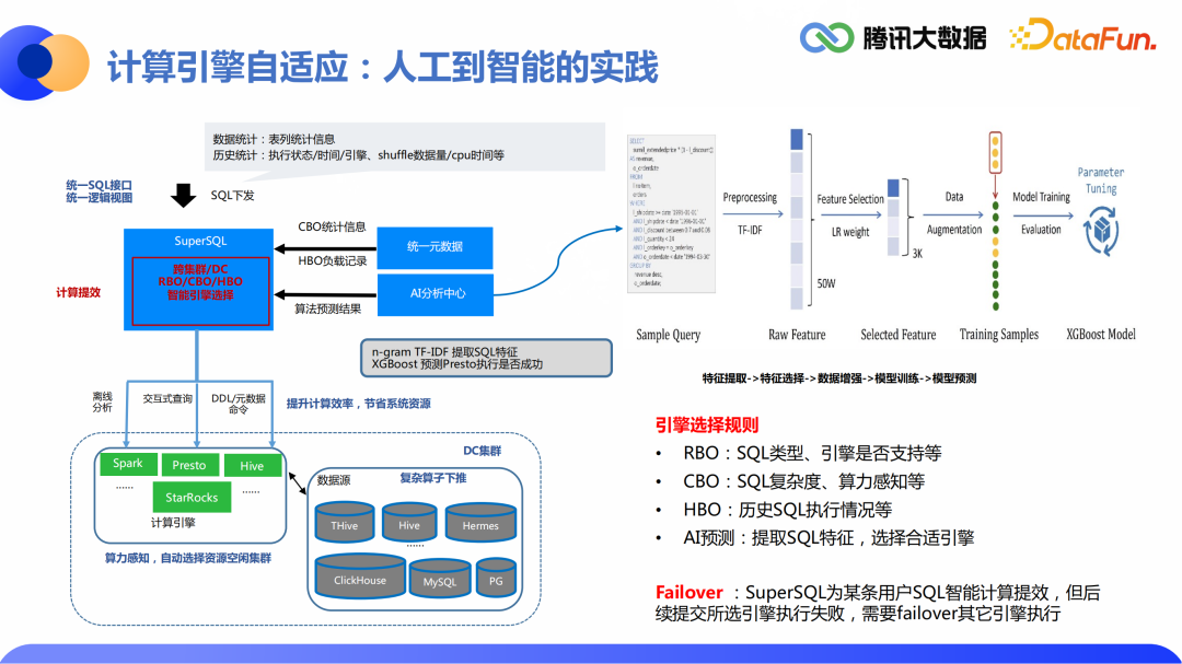 RBO:根据SQL类型以及引擎是否支持等维度判断当前SQL适合哪个引擎; CBO:基于SQL复杂度以及用户底层计算资源的感知判断适合提交至哪个引擎; HBO:基于历史SQL的执行情况进一步进行判断; AI预测:提取SQL特征,选择合适引擎。