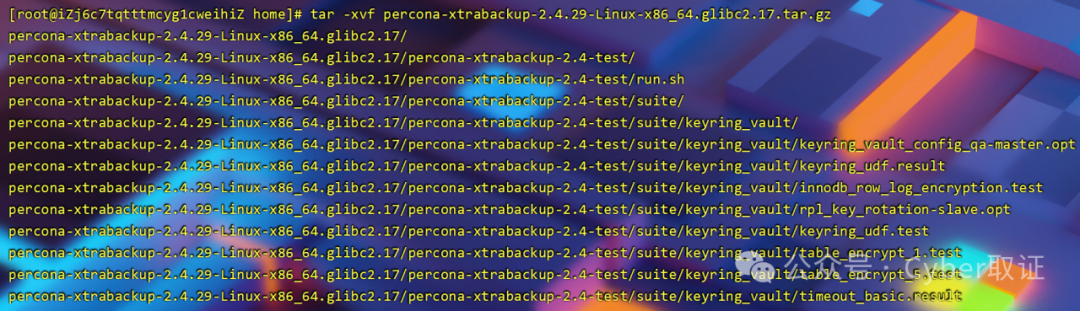 tar -xvf percona-xtrabackup-2.4.29-Linux-x86_64.glibc2.17.tar.gz#参数说明#-x 解压(eXtract)#-v 显示解压过程(文件列表)#-f 指定压缩包路径(必须紧跟文件名)