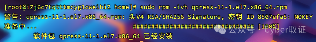 2) 安装:使用命令sudo rpm -ivh qpress-11-1.el7.x86_64.rpm进行安装,安装完成后即可使用。