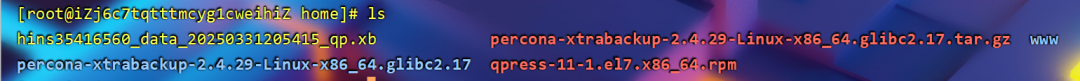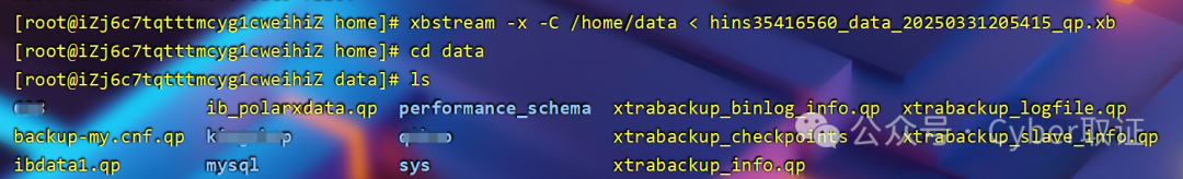 xbstream -x -C home/data < hins35416560_data_20250331205415_qp.xb#参数说明#-x 解压#-C 指定目录#< 输入文件
