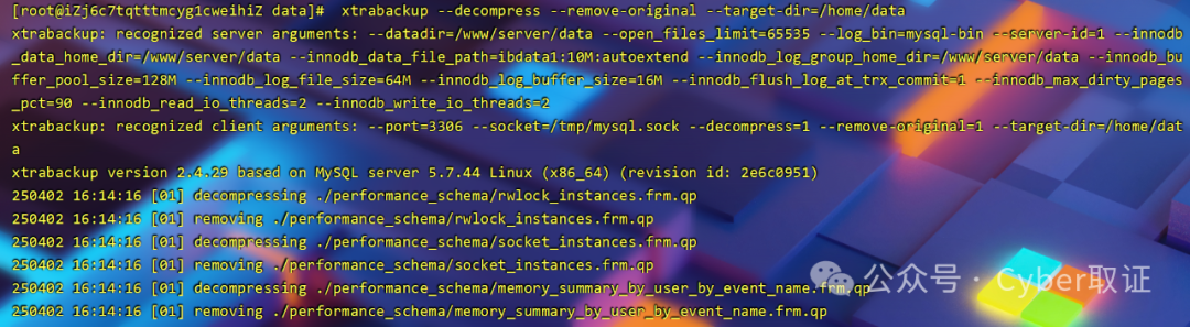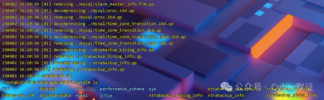 3. 解压.qb文件数据库文件:通过 xtrabackup --decompress命令解压.xb文件解压出来的.qp文件;