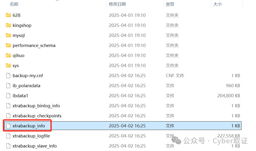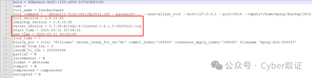 4. 确认核对版本是否匹配:经过解包解压后,已经可以恢复原始的数据库文件结构,可以通过解压后的“xtrabackup_info”文件查看数据库及xtrabackup的版本信息。
