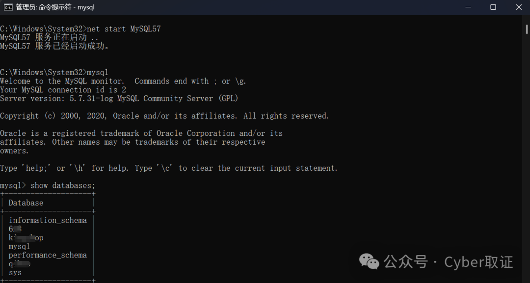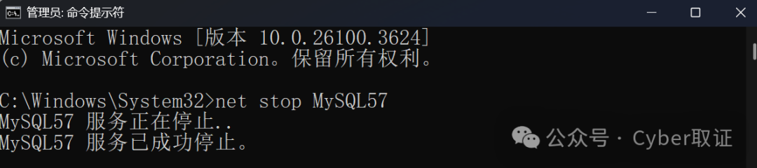 2. 停止数据库服务:通过net stop mysql停止MySQL服务,需要确认本机mysql服务具体名称;