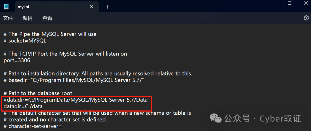 3.修改配置文件:编辑 my.ini 修改 datadir,将路径指向xb解压目录:C:\data(路径配置时Windows 推荐用正斜杠,避免转义问题 );